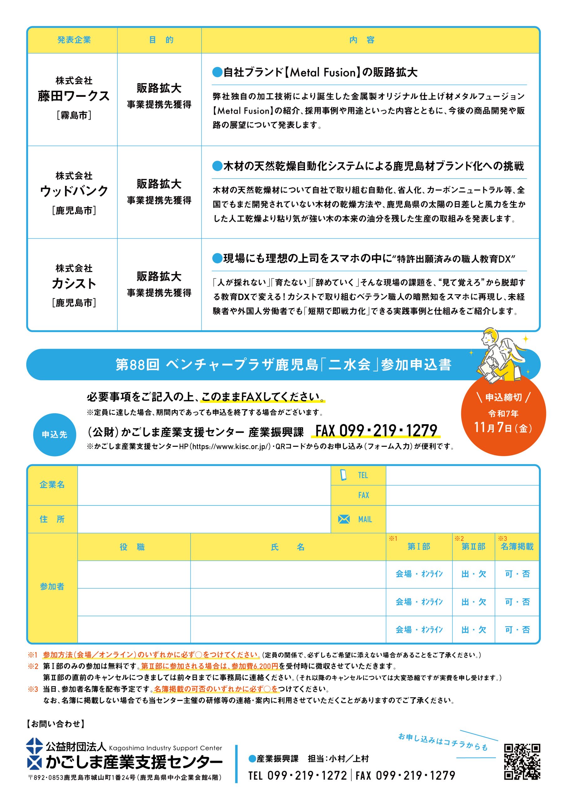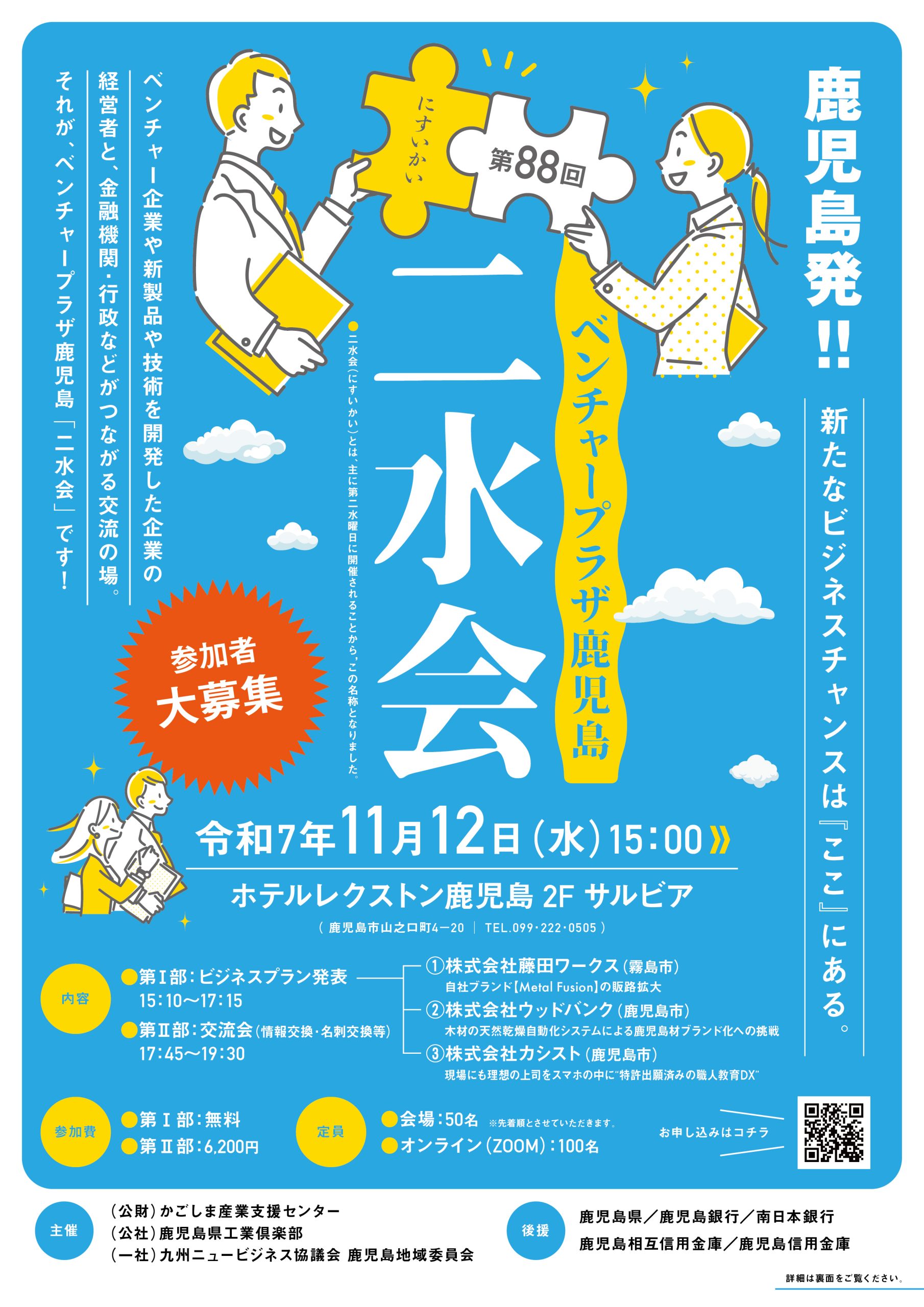 今回で88回目となるベンチャープラザ鹿児島「二水会」を,下記により開催いたしますので,御参加くださいますよう御案内申し上げます。